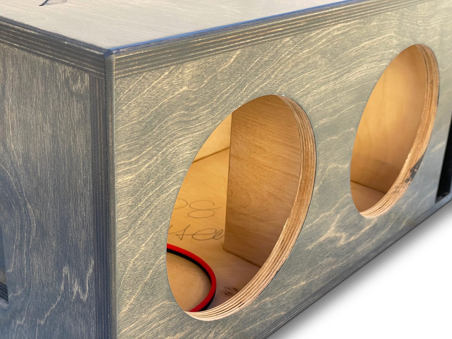 At Adire Audio the goal with the “branded series” enclosures is to offer subwoofer specific enclosure that are well build, well performing and good looking enclosure at an affordable price. Using premium ¾” Russian Baltic Birch with an addition baffle brace for extra strength, we are able to achieve a very strong and light enclosure. Using our refined assembly process produces an enclosure with NO visible screw holes anywhere on the enclosure. The entire enclosure is glued together with Titebond III and our braced baffle is strong enough to handle subwoofer setups up to 1500w. Finished off with our carbon gray stain and a polyurethane finish these enclosures have a unique look to set it apart from all the generic prefabs. Complete with a recessed Satin Nickel Brass binding posts and prewired with OFC 10g wire, you are ready to go the moment it arrives. These are also built with love, by hand right here in the UNITED STATES OF AMERICA.