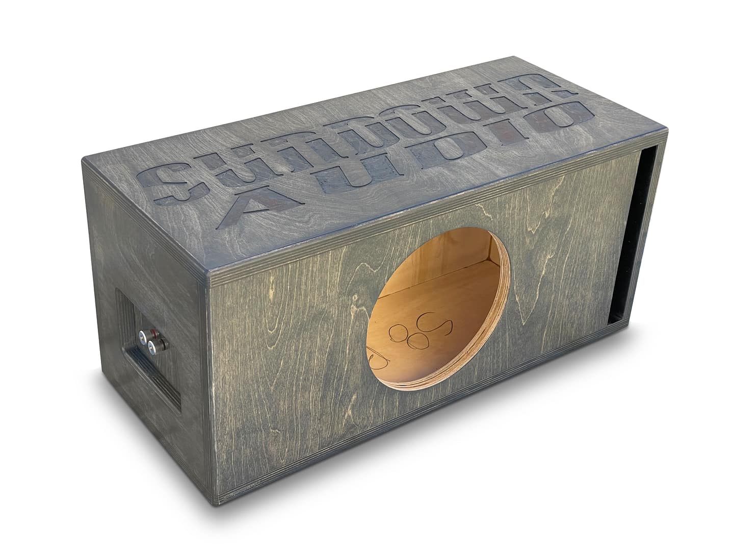 At Adire Audio the goal with the “branded series” enclosures is to offer subwoofer specific enclosure that are well build, well performing and good looking enclosure at an affordable price. Using premium ¾” Baltic Birch all around and an even thicker, 1″ baffle, we are able to achieve a very strong and light enclosure. Using our refined assembly process produces an enclosure with NO visible screw holes anywhere on the enclosure. The entire enclosure is glued together with Titebond III and our 1″ baffle is thick enough to handle subwoofer setups up to 3000w. Finished off with our carbon gray stain and a polyurethane finish these enclosures have a unique look to set it apart from all the generic prefabs. Complete with a recessed Satin Nickel Brass binding posts and prewired with OFC 10g wire, you are ready to go the moment it arrives. These are also built with love, by hand right here in the UNITED STATES OF AMERICA.